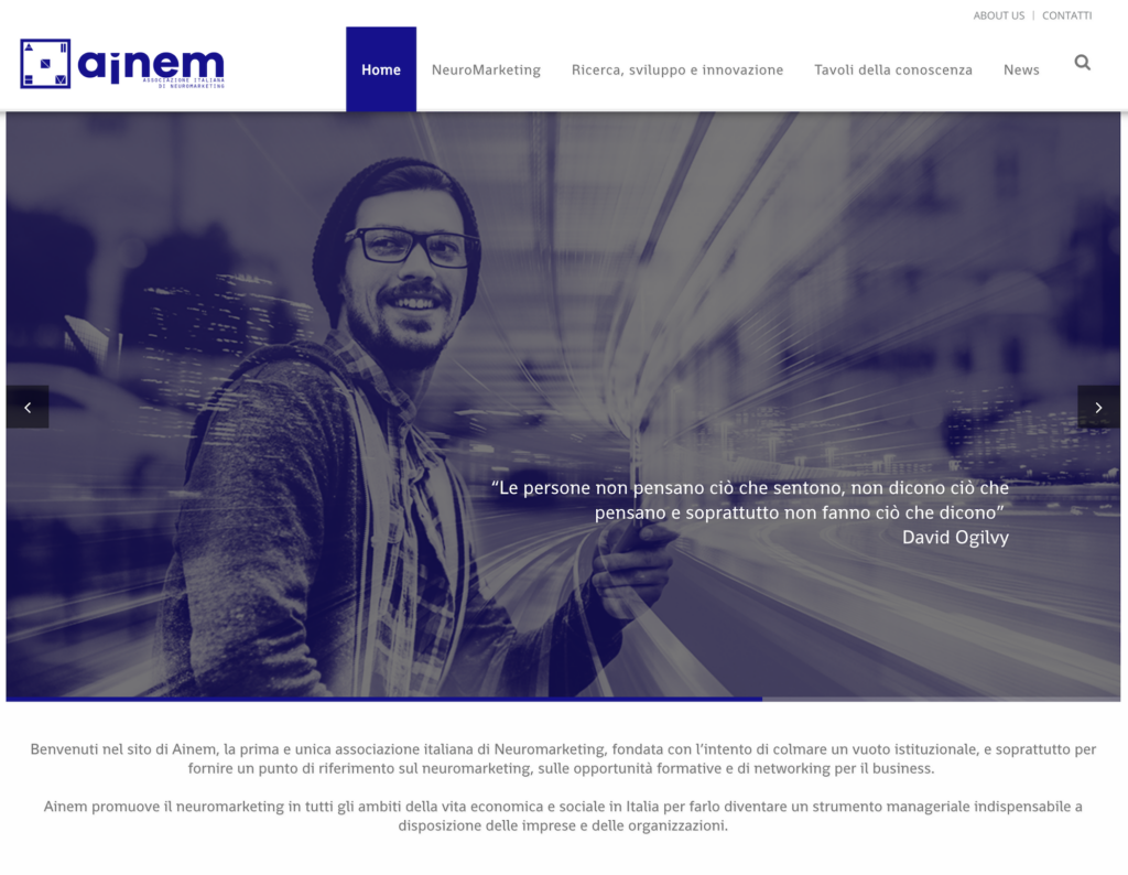 L’AINEM – Associazione Italiana di Neuromarketing è nata nel 2016 con lo scopo di diffondere in Italia la cultura e le conoscenze del neuromarketing e in senso lato delle neuroscienze applicate al business e alla vita sociale. Non è un’associazione di tipo tradizionale ma è un think tank dove non chiediamo quote economiche di adesione ma “quote cognitive”. Il futuro prossimo ci propone cambi di paradigma in termini di “nuove intelligenze” a cui dobbiamo arrivare preparati conoscendo soprattutto “la prima intelligenza”, che è quella prodotta dal cervello