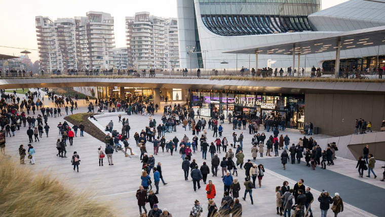 Un buon esempio di questo concetto sopra descritto, si può trovare nel nuovo Shopping District di Milano City Life. Costruito dopo le residenze abitative, di fatto ne costituisce un ponte e un collegamento con il resto della città, che trae beneficio da questo nuovo punto di incontro urbano. Il fil rouge di questo luogo è l’intrattenimento aggregativo oltre all’offerta di servizi correlati al tessuto urbano.