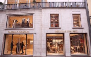 Vie prestigiose e luoghi di villeggiatura esclusivi come Porto Cervo o Cortina ospitano i suoi negozi. Il nuovo flagship, inaugurato in via Montenapoleone a Milano lo scorso gennaio, riflette perfettamente i valori del brand: colori caldi, legni chiari, arredi puliti e senza fronzoli e, al centro, la maxi stampa in bianco e nero del borgo di Solomeo per ricordare sempre il legame col territorio, da dove tutto parte.