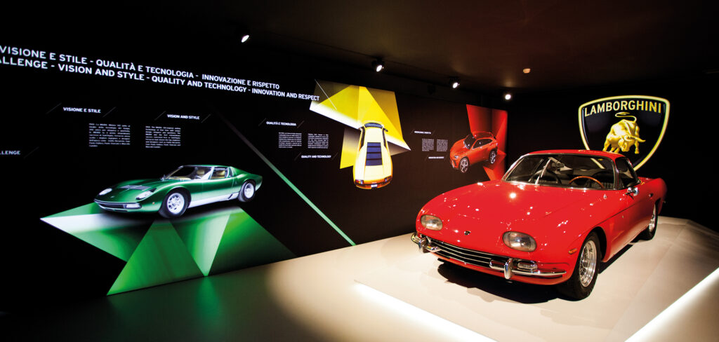 Utilizzando video emozionanti, tre chioschi verticali raccontano la storia dei prodotti e spiegano le diverse autovetture. Due di questi mostrano, all’interno di teche, un volante da corsa e un cerchione, collegando l’installazione alla realtà, accompagnata da eleganti effetti di luce. Il tutto è coadiuvato da un touch-table su cui passano diversi contenuti riguardanti l’ecosostenibilità, il ciclo di produzione e tutte le novità riguardanti il Museo di Sant’Agata Bolognese.